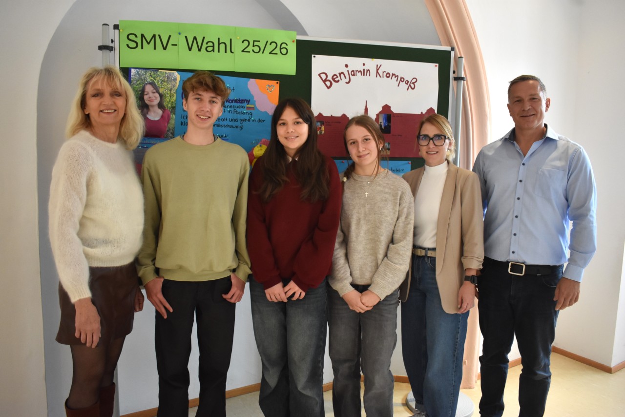 Benjamin Krompaß (Klasse 10E), Camila Alonzo Konietzny (Klasse 9E) und Sophia Ramesberger (Klasse 10C), zusammen mit Schulleiterin Astrid Schmid und den Verbindungslehrkräften Stefanie Wendl und Alexander Frankenberger.