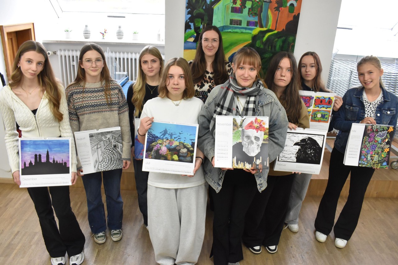 Die jungen Künstlerinnen (v.links) Isabella Mayerhofer (Klasse 9c), Josefine Wimmer (9c), Alina Berndorfer(10c), Anastasia Born (10e), Laura Müller (10c, das Bild wird von Samira Obermeier gezeigt), Hannah Kannamüller (8c), Mia Heß (8c) und Lea Hartl (8c) zeigen, mit wie viel Talent und Phantasie im Kunstunterricht ansprechende und aussagestarke Bilder entstehen. Der Kunstkalender der Maria-Ward-Realschule ist ab sofort im Sekretariat der Schule erhältlich.