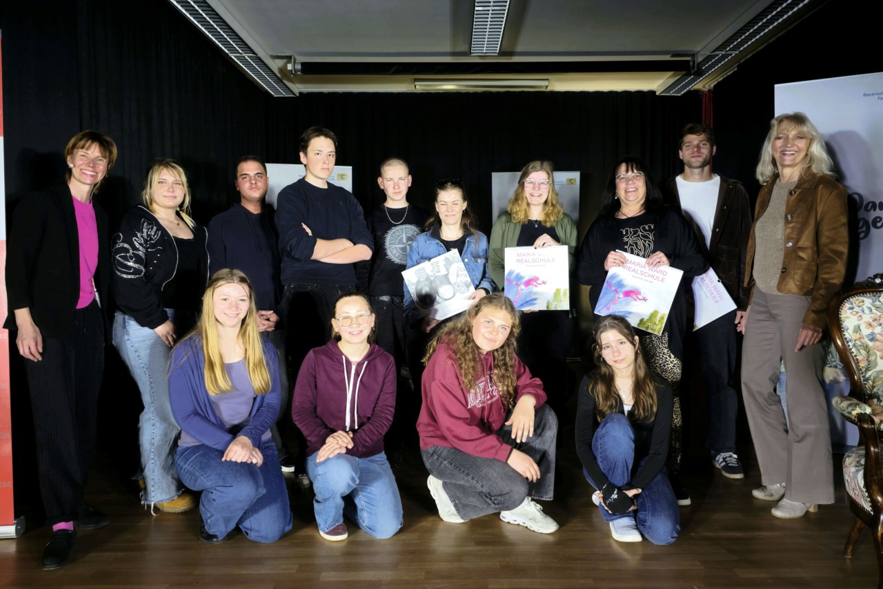 Sieben Schülerinnen und Schüler aus den achten Klassen (Sissy Aster, Alina Lienig, Adelina Rotari, Niclas Spak, Rosmarie Ortner, Xaver Staudinger und Veronika Wenzl), dazu der FOS-Praktikant Péter Váczi erarbeiteten aus dem Erzählten zusammen mit Evelyn Hornberg ein Bühnenstück. Richtig „professionell“ wurde dabei von der Schauspielerin auch auf Stimmbildung, Improvisation und Choreografie geachtet.