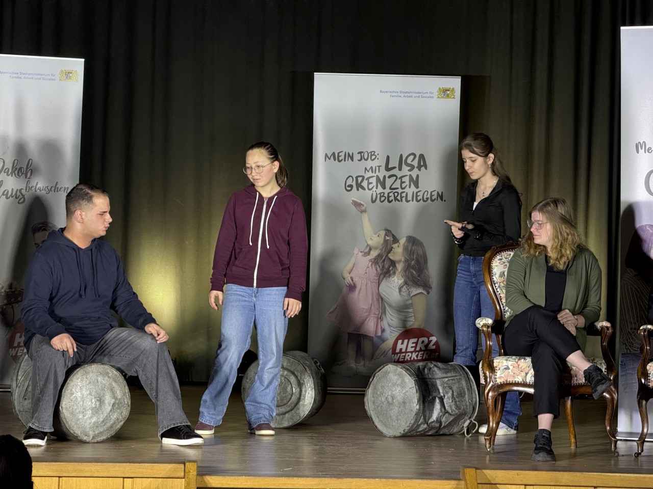 „Herzlich willkommen zu unserer szenischen Talkshow der Kampagne Herzwerker des Bayerischen Staatsministeriums für Familie, Arbeit und Soziales“ – so wurden die Schülerinnen und Schüler der achten Klassen an der Maria-Ward-Realschule zur Aufführung des Projekts „Herzwerker“ begrüßt, einer Bühnenshow am Ende einer abwechslungsreichen und informativen Woche, in der unterschiedliche soziale Berufe aus der Sicht von „Gastexperten“, aber auch aus dem Blickwinkel von Schülerinnen und Schülern vorgestellt wurden.